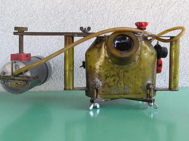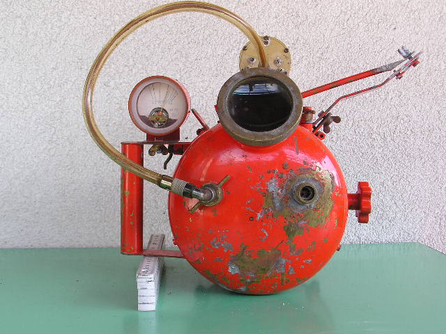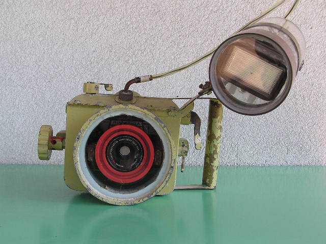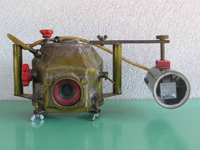 Gehäuse aus Messing für EXA Ia, gebaut 1963/194, Vorlage Buch von M.Krödel "Tauchzubehör selbstgebaut". Gehäuse wurde nachträglich mit 60°-Prisma (Fa. Gueridon) und Elektronenblitzgerät versehen. | |