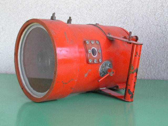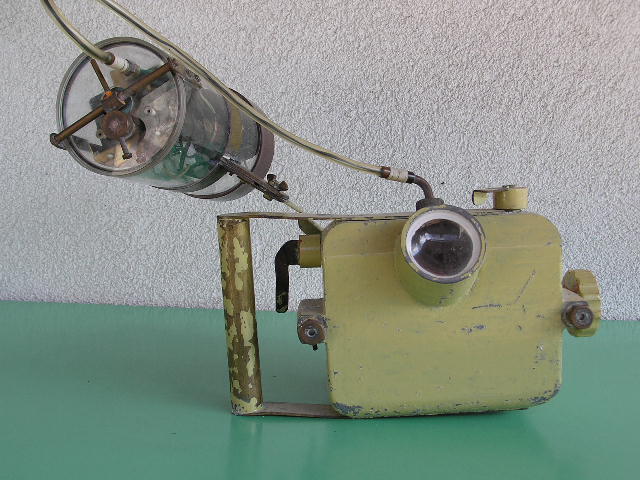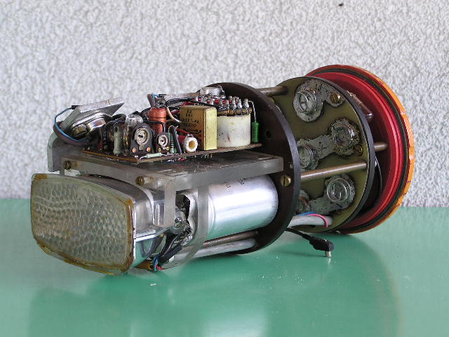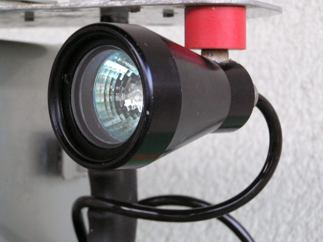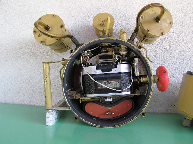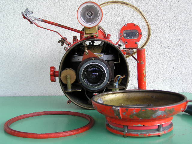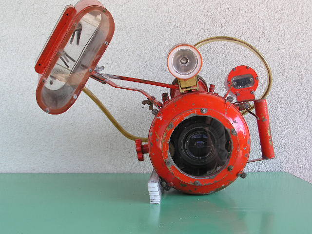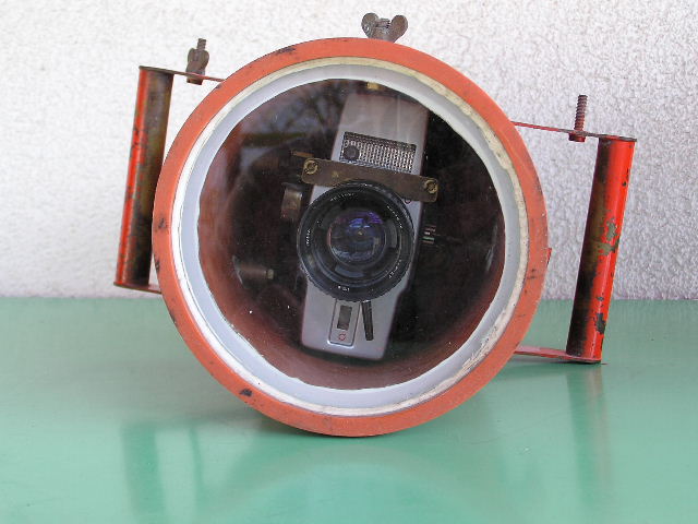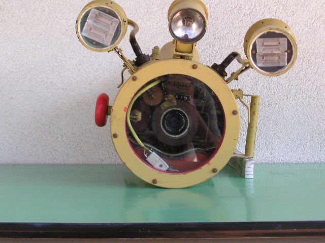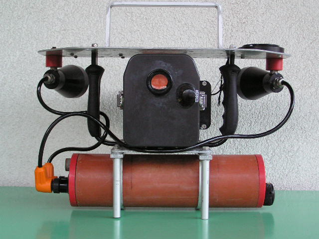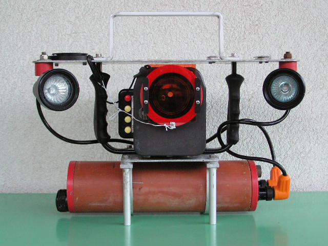 Gehäuse aus PVC-Rohr Durchmesser 160 mm für sowjetische Super-8-Kamera. Beleuchtung mittel zweier Scheinwerfer, Durchmesser 160 mm, je 55 Watt Halogen (umgebaute Nebelscheinwerfer, NiCd-Akkus aus russischer Militärtechnik, 7,2 V, 20 Ah, nachträglich gegen Auslaufen abgedichtet. Leider nicht mehr vorhanden. Die Ansteuerung der Scheinwerfer erfolgt über Relais von der Kamera aus. | |