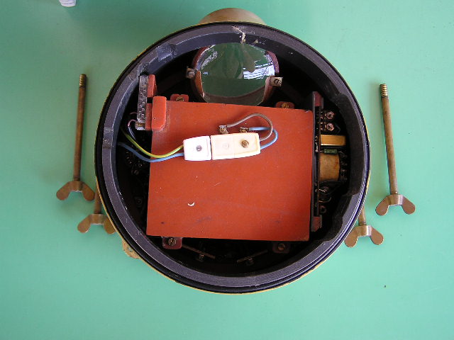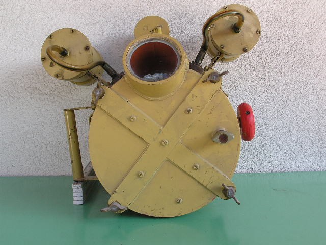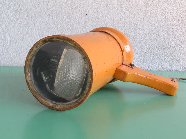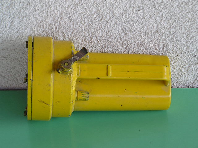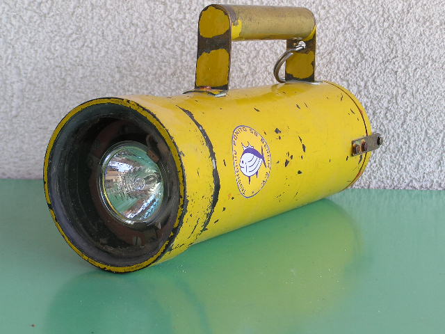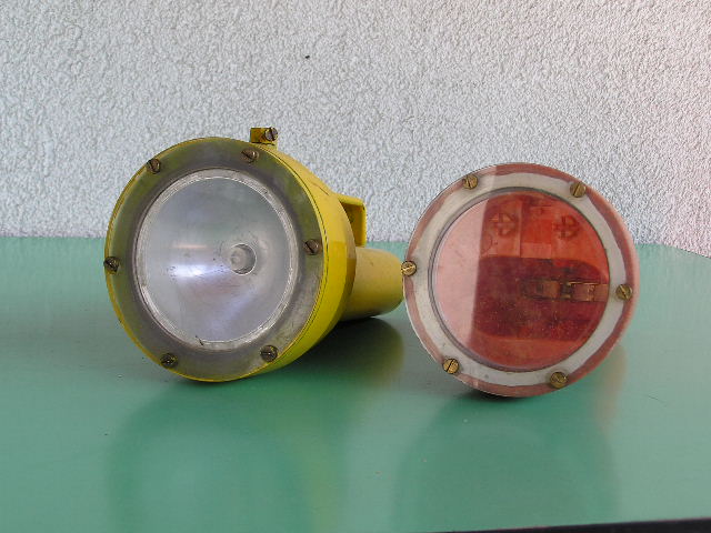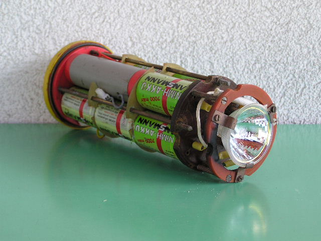 Umgebaute ARTAS-Halogen-Lampe. Im linken Bild ist rechts die Originallampe mit aufgesetzter Scheibenhalterung zu sehen. Schalter mit wasserdichter Durchführung, Betrieb mit Monozellen oder NiCd-Akkus und Lademöglichkeit von außen | |